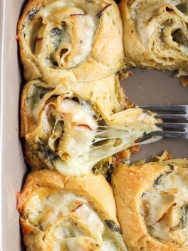 Very! After you have a cohesive rectangle, spread the dough with pesto, sprinkle with cheese, and lay the turkey on top. Roll ’em up, slice it, and bake till gooey and golden brown. I prefer serving these cheesy turkey pesto rolls warm! If you have leftovers, they also warm back up deliciously in the toaster oven.
